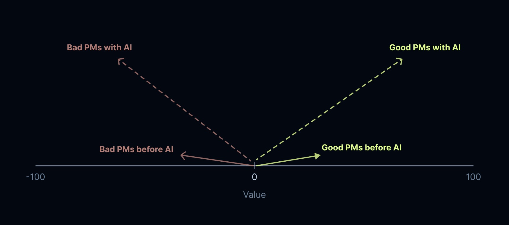 (此处原文有图表:糟糕的 PM 使用 AI 产生负价值,优秀的 PM 使用 AI 产生高价值)