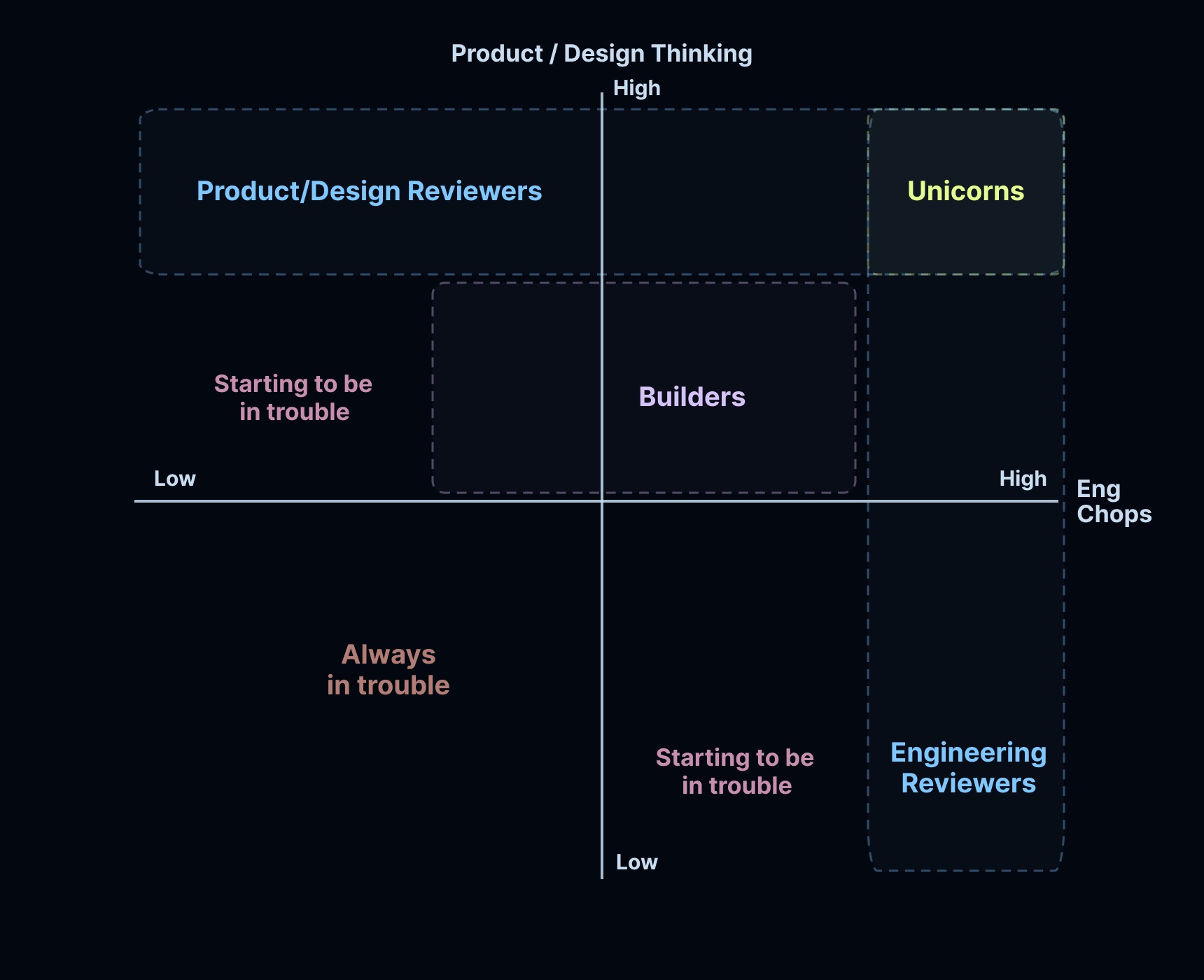 - 独角兽(Unicorns): 高工程能力 + 高产品/设计思维(构建者)